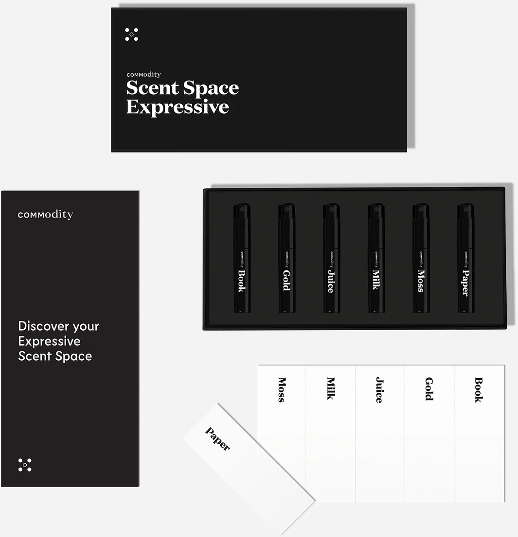 In this exclusive set, you will discover the versatile world of Commodity's Expressive Scent Space. It contains high-quality samples of Milk, Gold, Juice, Book, Moss and Paper. Each of these creations invites you to find your own personal fragrance signature and play with the different facets of your personality. Whether you are looking for creamy comfort, sparkling freshness or woody depth - this kit is your ticket to a new, modern fragrance journey.