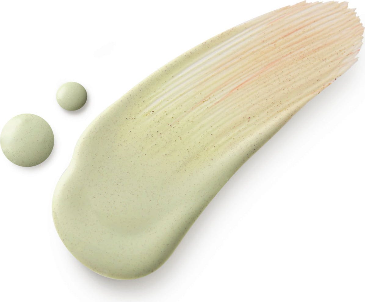 - Dispense 2-3 drops onto the hands or directly onto the face and press into the skin. The formula melts into the skin and instantly changes colour from green to beige.