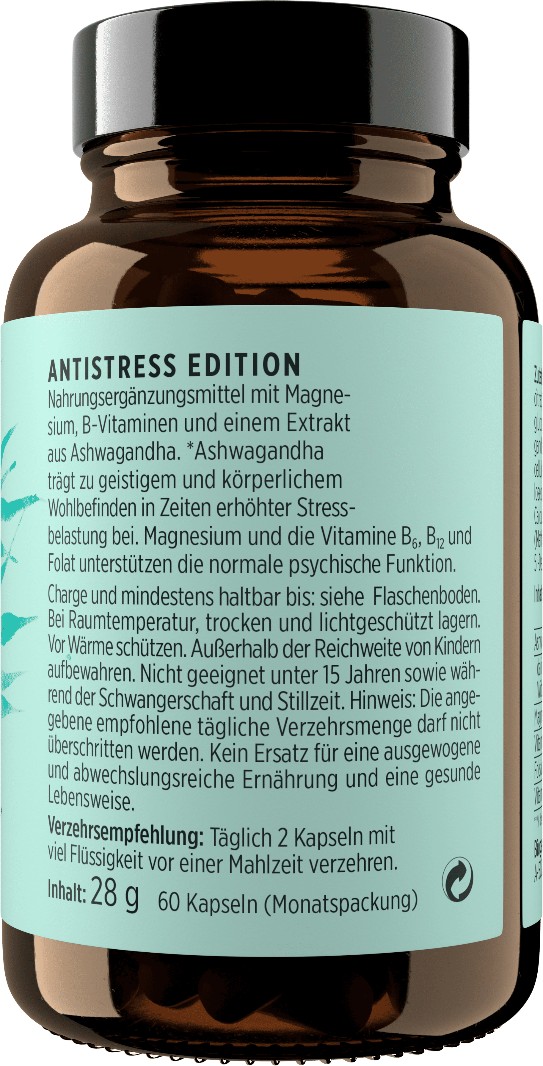 Magnesium mix (Magnesium citrate, Magnesium (as Oxide), Magnesium gluconate, Magnesiumcarbonat), Ashwagandha, Hydroxypropyl methylcellulose (Capsule shell), Filler (Cellulose), Pyridoxal 5 'Phosphate, Metafolin® (calcium L-methylfolate), Vitamin B12 (Methylcobalamin, Vitamin B12 (hydroxycobalamin), 5′-Desoxyadenosylcobalamin)