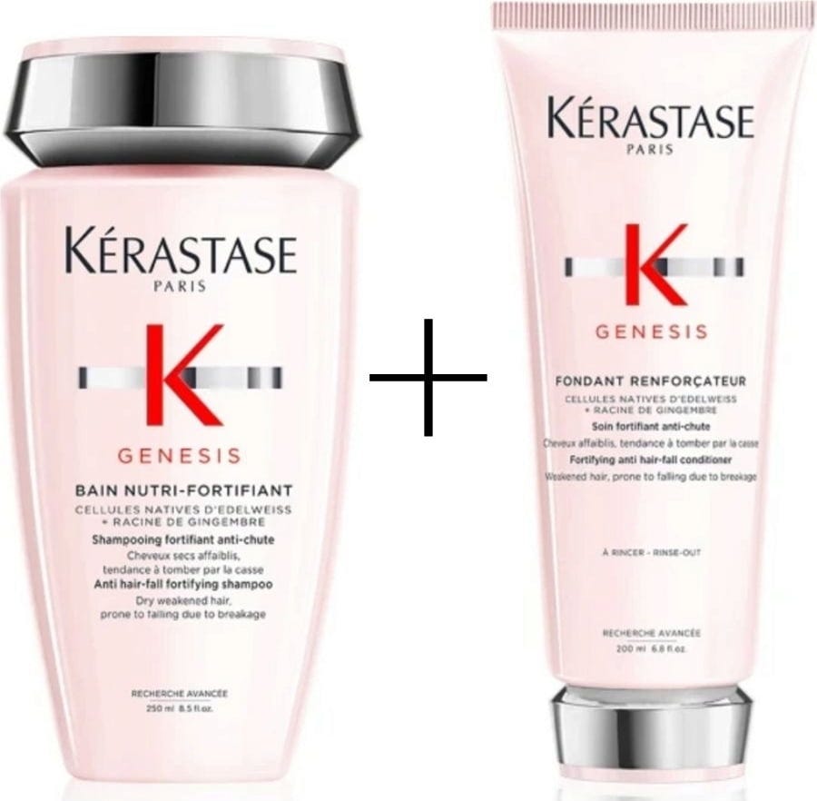 The Genesis Bain Nutri-Fortifiant shampoo by Kérastase thoroughly cleanses strong and dry hair and offers protection against hair breakage and hair loss. It removes residue from the hair and scalp, while the scalp is nourished thanks to stimulating ginger. Edelweiss moisturises and strengthens, reducing breakage and hair loss and making hair easier to comb.